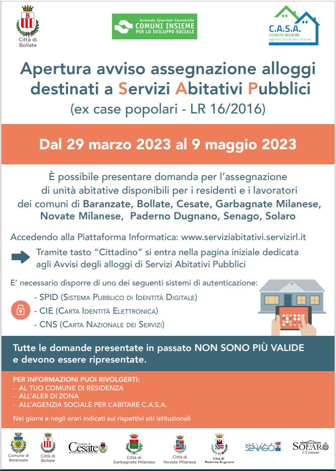 È possibile presentare domanda per l'assegnazione di unità abitative disponibili per i residenti e i lavoratori dei comuni di Baranzate, Bollate, Cesate, Garbagnate Milanese, Novate Milanese, Paderno Dugnano, Senago e Solaro.