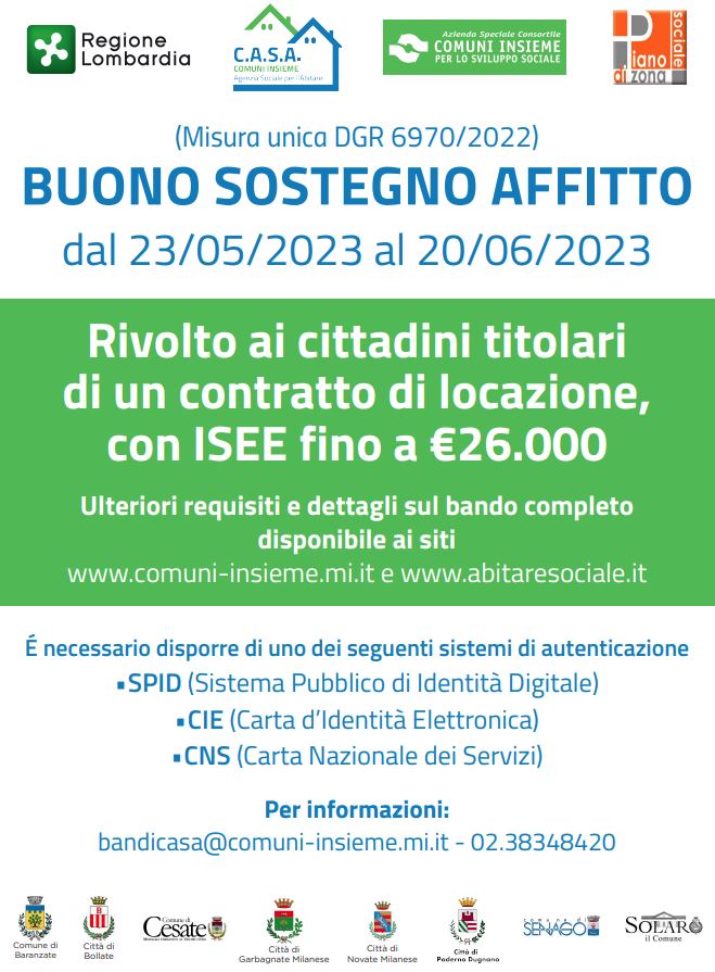 ASC Comuni Insieme rende nota l’apertura dell’avviso “BUONO SOSTEGNO AFFITTO 2023 - MISURA UNICA (DGR N° XI/6970 del 19/09/2022)”, a sostegno dei nuclei familiari per il mantenimento dell’abitazione in locazione nel mercato privato e per il contenimento dell’emergenza abitativa.